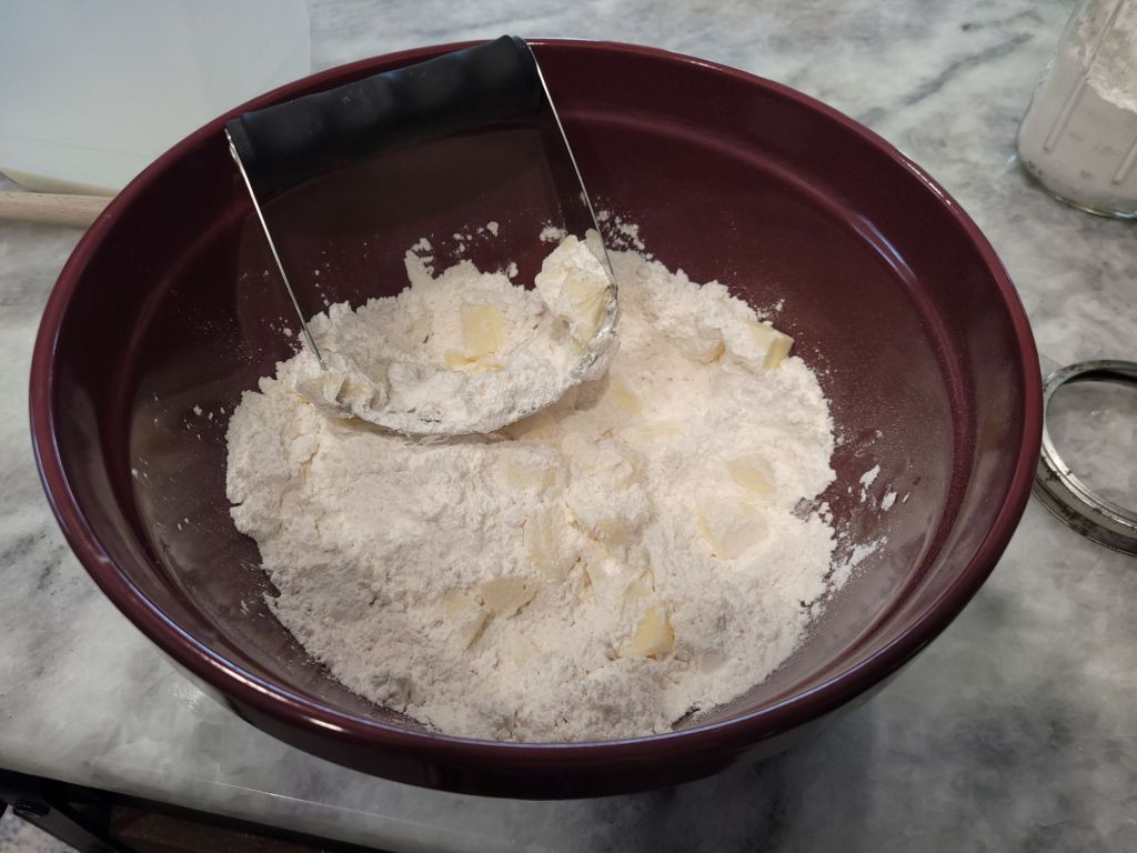 Using your pastry cutter, work your butter into the flour. You will have to stop and pull the butter off the cutter a couple of times before it is incorporated.