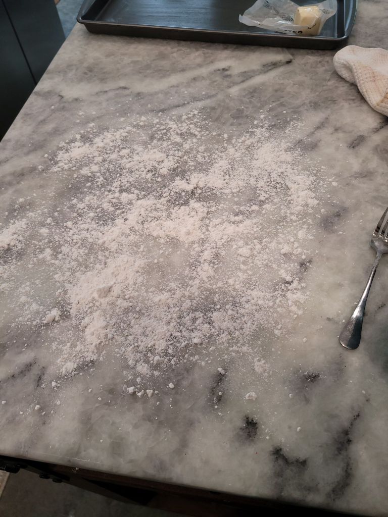 You want to work the butter just enough that the flour looks like a good crumble, and it’s the butter is only slightly sticking to your cutter or fork.