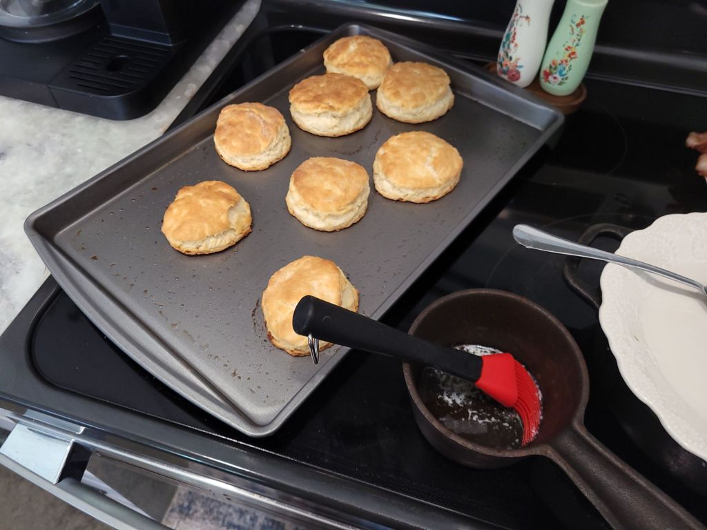Who doesn’t love a fluffy biscuit with their breakfast? That soft fluffy inside, with a lite crispy crust on the bottom, cut open and smothered with homemade strawberry freezer jam or honey.