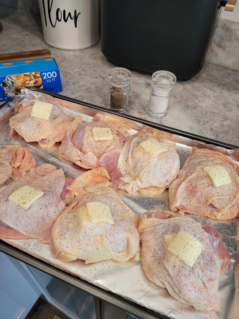 Next, place the chicken on the sheet pan, put a small slice of butter on top of the skin, and add your seasoning.