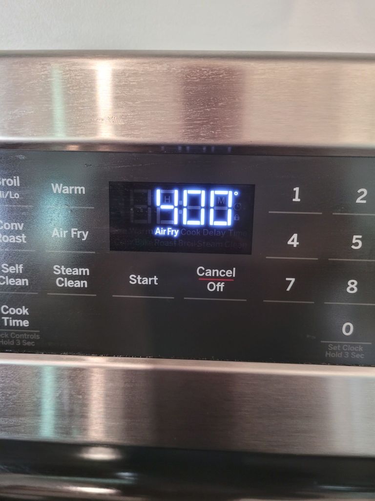 Now my oven has a built-in air fryer. If you are using an in oven air fryer, you want to go ahead and heat that baby up. Turn it on to 400 degrees.