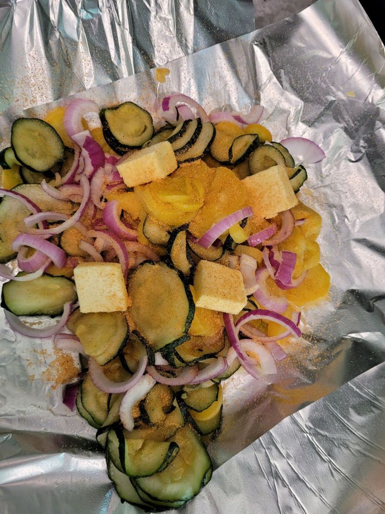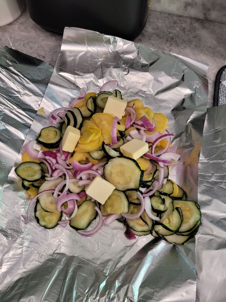 Slice your squash, zucchini, and onion and lay it on the aluminum foil. If you want, use your hands to give the veggies a little toss to mix them together.